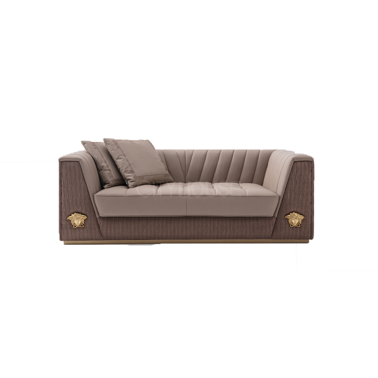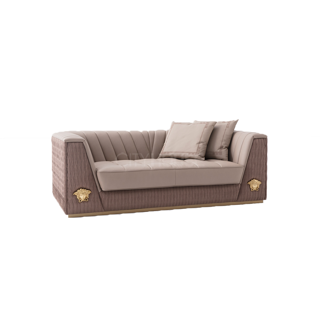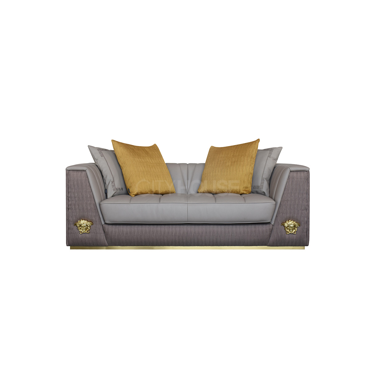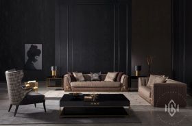 • 主材:俄罗斯松木+实木多层板 主体填充物:高密度海绵 装饰五金:不锈钢拉丝香槟金 抱枕填充物:天然羽绒 样色面料:NG2125-05A(后背、扶 手前)+NGB106(座包、靠背) 抱枕:2个大抱枕+1个小抱枕